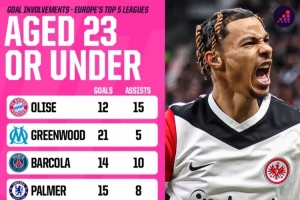 ■歐洲五大聯(lián)賽23歲及以下球員進(jìn)球+助攻總榜: