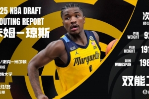 卡姆-瓊斯是來(lái)自馬奎特大學(xué)的大齡即戰(zhàn)力后衛(wèi),技術(shù)成熟度高,對(duì)擋拆的運(yùn)用與終結(jié)的創(chuàng)造力能達(dá)到NBA層級(jí),但運(yùn)動(dòng)能力是他的最大短板。進(jìn)入NBA后,球隊(duì)可能需要在防守端把他“藏一藏”,避免其頻繁遭遇擋拆或換防的場(chǎng)景,會(huì)比較適配中鋒蹲坑的五外體系,可以充當(dāng)打10-15分鐘的替補(bǔ)持球手角色,但23歲的年紀(jì)基本上沒(méi)有太多的改造空間,手握次輪簽的球隊(duì)完全可以將其視作板凳奇兵押上一注。