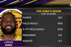 據(jù)比賽轉(zhuǎn)播商Spectrum SportsNet賽后統(tǒng)計(jì),詹姆斯在最近10場(chǎng)比賽中場(chǎng)均得到25.1分5.6籃板5.7助攻,投籃命中率55%,三分命中率33%。