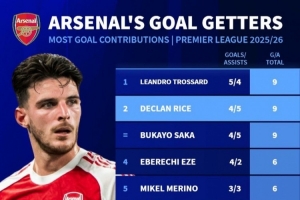 阿森納本賽季英超參與進(jìn)球榜: