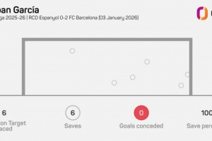 據(jù)Opta統(tǒng)計,霍安·加西亞本場比賽做出6次撲救,2023年11月特爾施特根對陣皇家社會之后,他是首位西甲單場6次撲救+零封的巴薩門將。