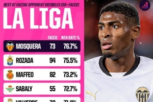 Opta指出,莫斯克拉是西甲阻止對手過人成功率最高的球員,對手73次嘗試過掉他,其中76.7%的過人被他阻止,在嘗試阻止對手過人次數(shù)50+的西甲球員中,他的成功率最高。
