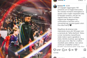 布雷默達(dá)成尤文生涯出戰(zhàn)100場里程碑,他在社交媒體上寫道:“能夠身披黑白戰(zhàn)袍出戰(zhàn)100場比賽,我深感自豪。我正在這家俱樂部經(jīng)歷美妙的時光,我要感謝整個尤文大家庭,這對我意義非凡?!?/p>