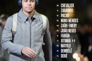 30-舍瓦利耶、6-扎巴爾尼、51-帕喬、25-努諾·門德斯、33-扎伊爾·埃梅里、87-若昂·內(nèi)維斯、8-法比安·魯伊斯、17-維蒂尼亞、24-馬尤盧、10-登貝萊、14-杜埃