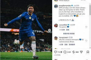 恩佐社媒曬出慶祝進(jìn)球的照片,并寫道:“艱難的時期,但這支球隊總能挺身而出,拼盡全力。感謝無論我們?nèi)ネ翁幎紒淼浆F(xiàn)場支持的球迷們,你們太棒了。”