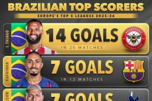 本賽季五大聯(lián)賽巴西球員射手榜(僅統(tǒng)計(jì)聯(lián)賽)