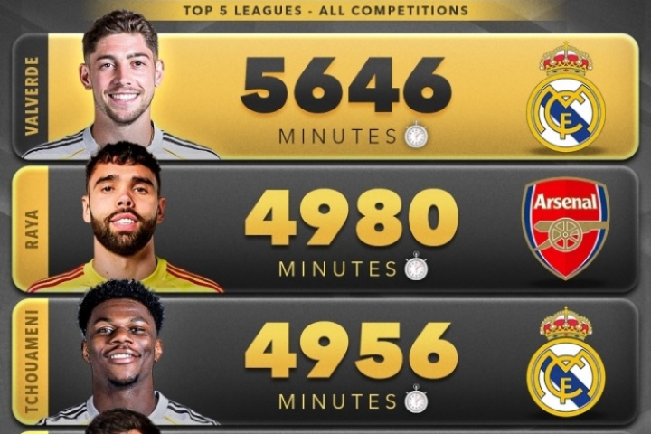 體育資訊07月16日訊 隨著世俱杯的結(jié)束,2024/25賽季也劃上了句號。外媒score90統(tǒng)計(jì)了本賽季五大聯(lián)賽球員在俱樂部的出場時間,巴爾韋德以5646分鐘斷層排名第一,第二是阿森納門將拉亞。