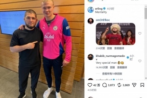 體育資訊1月7日訊 曼城前鋒哈蘭德更新社媒動態(tài),曬出與UFC傳奇選手小鷹(哈比卜·努爾馬戈梅多夫)的合照。