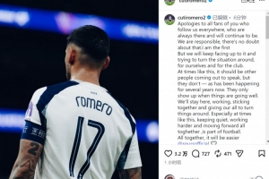體育資訊1月8日訊 英超第21輪比賽,熱刺客場(chǎng)2-3不敵伯恩茅斯,熱刺后衛(wèi)羅梅羅社媒發(fā)文,向球迷表達(dá)歉意。