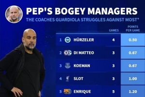 體育資訊1月8日訊 德國轉(zhuǎn)會市場統(tǒng)計了瓜迪奧拉對陣不同教練的場均積分,并列出瓜帥克星榜單,赫爾澤勒居首,斯洛特、克洛普、阿莫林在列。