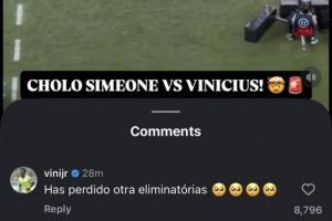 賽后名記羅馬諾在個(gè)人社媒賬號轉(zhuǎn)發(fā)了這期沖突的現(xiàn)場視頻,而維尼修斯本人也現(xiàn)身評論區(qū),評論道:“(西蒙尼)又輸?shù)粢粓鎏蕴悺!?/strong>