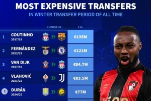 體育資訊1月9日訊 曼城已經(jīng)官宣簽下塞梅尼奧,德轉(zhuǎn)數(shù)據(jù)統(tǒng)計顯示他也是歷史第7貴的冬窗引援。