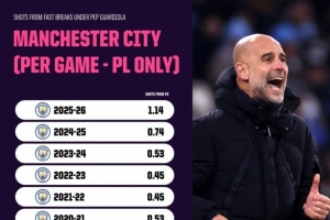 瓜迪奧拉執(zhí)教曼城英超場均快速反擊射門次數: