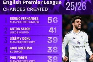 體育資訊1月9日訊 數(shù)據(jù)機構(gòu)squawka統(tǒng)計了本賽季英超創(chuàng)造機會榜,曼聯(lián)隊長B費斷崖領(lǐng)跑。