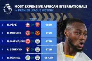 體育資訊1月9日訊 伯恩茅斯前鋒塞梅尼奧以7200萬歐元的價格加盟曼城,根據(jù)德轉(zhuǎn)統(tǒng)計,他成為英超歷史上轉(zhuǎn)會費第四高的非洲球員,僅次于尼古拉斯·佩佩、姆伯莫和馬爾穆什。
