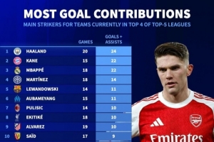 體育資訊1月9日訊 《轉(zhuǎn)會(huì)市場(chǎng)》統(tǒng)計(jì)了本賽季五大聯(lián)賽排名前四的球隊(duì)各自主力中鋒的參與進(jìn)球情況,哈蘭德、凱恩、姆巴佩分列前三,戴維、約克雷斯、貢薩洛·拉莫斯列倒數(shù)前三。