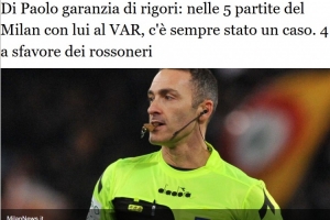 一項(xiàng)引人關(guān)注的統(tǒng)計(jì)數(shù)據(jù),在本賽季由迪保羅作為VAR裁判執(zhí)法的米蘭比賽中,總是會(huì)出現(xiàn)點(diǎn)球判罰。