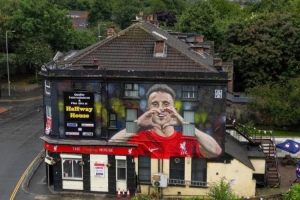 這幅畫(huà)描繪了若塔慶祝進(jìn)球的瞬間。壁畫(huà)位于距離紅軍主場(chǎng)不遠(yuǎn)處的半路屋酒吧外墻上,這里離若塔自2020年9月從狼隊(duì)加盟后享受過(guò)無(wú)數(shù)歡樂(lè)時(shí)光的地方僅幾步之遙。