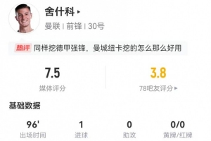 體育資訊1月12日訊 曼聯(lián)在本輪足總杯1-2不敵布萊頓,舍什科本場數(shù)據(jù)如下: