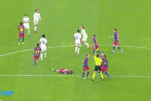 體育資訊01月12日訊 西超杯決賽巴薩vs皇馬,第56分鐘,拉菲尼亞沖上去為隊友出頭,被巴爾韋德推到地上滾了一圈,巴爾韋德吃到黃牌!