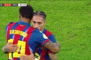西班牙超級杯決賽,巴薩3-2擊敗皇馬奪冠。拉什福德第83分鐘換下拉菲尼亞,第95分鐘時巴薩3-2領(lǐng)先皇馬,拉什福德跑出半場大單刀,慢悠悠錯失良機。轉(zhuǎn)過頭來皇馬進攻,姆巴佩直塞禁區(qū),居萊爾下底倒三角,卡雷拉斯點球點附近直面球門的推射被霍安沒收,巴薩險些被絕平,拉什福德幾乎全程眼神防守。