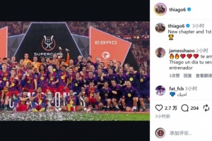 目前擔(dān)任巴薩助教的蒂亞戈更新社媒動(dòng)態(tài),曬出球隊(duì)大合照,慶祝球隊(duì)奪冠,配文:“新的篇章,本賽季首冠?!?/p>