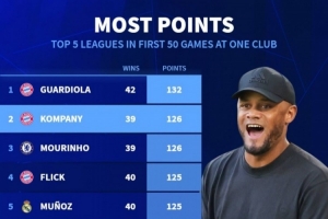 體育資訊1月12日訊 德國轉會市場統(tǒng)計了五大聯(lián)賽單一俱樂部主帥前50場聯(lián)賽的積分,并列出前50場聯(lián)賽拿分最多榜單,孔帕尼執(zhí)教拜仁前50場聯(lián)賽拿到126分,僅少于瓜迪奧拉。