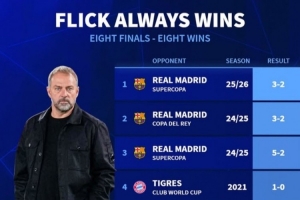 體育資訊1月12日訊 巴薩在本輪西超杯3-2力克皇馬,弗里克延續(xù)了自己執(zhí)教決賽必勝的完美戰(zhàn)績?!掇D(zhuǎn)會市場》也回顧了這8場比賽的比分。