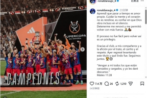 體育資訊1月13日訊 巴薩后衛(wèi)阿勞霍更新社媒動態(tài),談到了復(fù)出并隨隊贏得西超杯的感受。