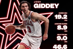 體育資訊1月13日訊 公牛官推今天發(fā)布吉迪場均數(shù)據(jù)海報(bào),為其全明星拉票。