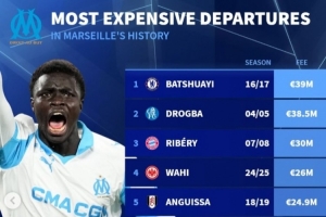 體育資訊1月15日訊 羅馬已經(jīng)官宣引進馬賽18歲中鋒瓦斯,《轉(zhuǎn)會市場》也統(tǒng)計了馬賽隊史最貴轉(zhuǎn)出情況,巴舒亞伊居首。