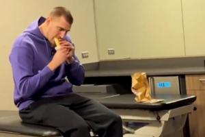 在視頻中,約基奇首先說道“因?yàn)槟莻€(選秀廣告)我從不吃Taco Bell。”鏡頭一轉(zhuǎn),是他在更衣室悠閑品嘗卷餅一幕。