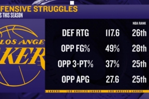 體育資訊1月17日訊 今日,ESPN總結了湖人本賽季至今糟糕的防守數(shù)據(jù):