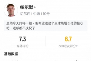 體育資訊1月18日訊 英超第22輪,切爾西2-0布倫特福德。帕爾默首發(fā)出戰(zhàn),打滿全場(chǎng),打進(jìn)1粒點(diǎn)球,2次過人成功,2次攔截,評(píng)分7.3。
