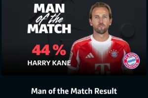 凱恩在本場比賽打進1球,獲得了44%的得票率。值得一提的是,替補獨造4球的奧利塞并未進入候選名單。