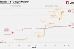 數(shù)據(jù)統(tǒng)計(jì)顯示,拜仁上次在德甲聯(lián)賽客場(chǎng)半場(chǎng)落后情況下在下半場(chǎng)打進(jìn)5球,還是1976年9月:半場(chǎng)0-3波鴻,最終6-5獲勝。