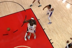 小摩擦!斯瑪特突破上籃得手&起身時壓到里斯 隨后回防拼搶犯規(guī)