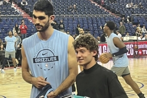 賽前,灰熊內(nèi)線(xiàn)阿爾達(dá)馬和梅奔F1車(chē)手安東內(nèi)利兩人交換了球衣。
