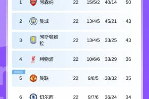 體育資訊1月19日訊 今日英超第22輪,維拉0-1不敵埃弗頓。英超前四——阿森納、曼城、維拉、利物浦,均遭遇連續(xù)兩輪不勝,本輪僅曼城、維拉輸球。最新積分榜如下: