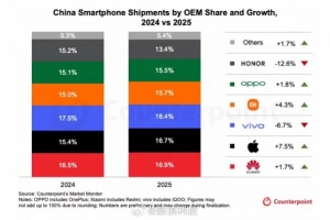 體育資訊1月19日訊 Counterpoint Research 在今日發(fā)布的新聞稿中表示,中國(guó)智能手機(jī)市場(chǎng) 2025 年第四季度出貨量同比減少 1.6%,而 2025 年全年的出貨則減少了 0.5%。