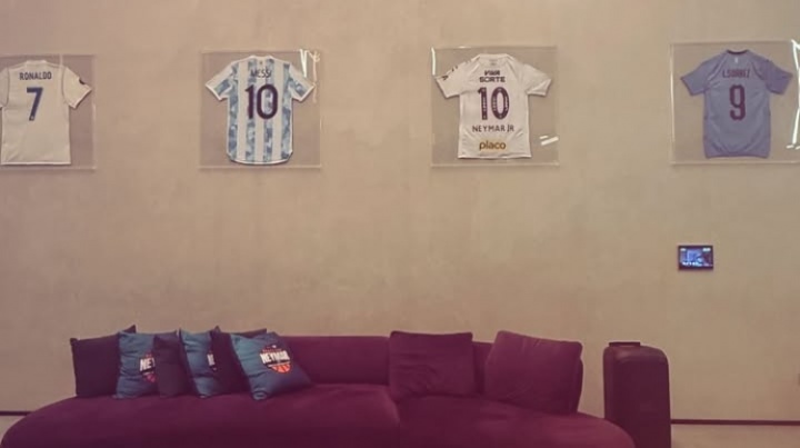 內(nèi)馬爾社媒曬球衣收藏:皇馬C羅、阿根廷梅西、桑托斯內(nèi)馬爾、烏拉圭蘇亞雷斯