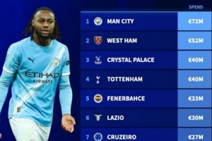 體育資訊1月19日訊 德轉(zhuǎn)盤點(diǎn)了冬窗至今花費(fèi)榜單,其中曼城居首,具體如下: