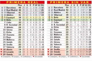 體育資訊1月20日訊 《阿斯報(bào)》統(tǒng)計(jì)了“如果沒有VAR”的西甲積分榜情況,巴薩將增加1分、皇馬將增加2分,兩隊(duì)將同積50分。