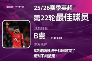 2025-2026賽季英超火熱進(jìn)行中,體育資訊和咪咕體育聯(lián)合發(fā)起每輪英超最佳球員評(píng)選活動(dòng)!第22輪評(píng)選結(jié)果已經(jīng)出爐,曼聯(lián)隊(duì)長(zhǎng)B費(fèi)送出助攻幫助球隊(duì)擊退曼城,贏下曼市德比,成功當(dāng)選本輪英超最佳。