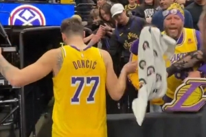 GIF-東契奇和詹姆斯賽后送毛巾 球迷都欣喜若狂