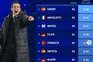 體育資訊1月23日訊 本賽季維拉在歐聯(lián)杯表現(xiàn)出色,7戰(zhàn)6勝1負(fù),德轉(zhuǎn)也盤點(diǎn)了自2020年以來(lái)各位主帥在歐戰(zhàn)場(chǎng)均積分榜,其中埃梅里居首,具體如下(至少執(zhí)教30場(chǎng)比賽):