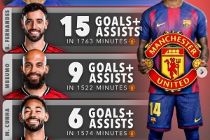 作為對比,曼聯(lián)球員本賽季參與進(jìn)球最多的是B費,1763分鐘參與15球,鋒線三將姆伯莫參與9球、庫尼亞參與6球、舍什科參與6球。