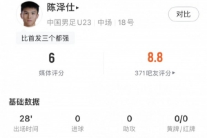 體育資訊1月25日訊 U23亞洲杯決賽,U23國足0-4不敵日本U23,奪得賽事亞軍。替補出戰(zhàn)的陳澤仕數(shù)據(jù)如下: