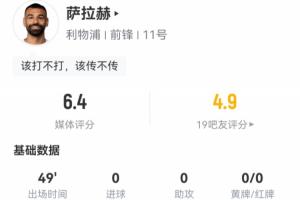 送出助攻,薩拉赫數(shù)據(jù):3射兩正,21次丟失球權(quán),地面對抗零成功