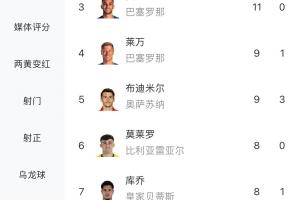 姆巴佩以21球領(lǐng)跑西甲射手榜,穆里奇14球暫排第二,費(fèi)蘭11球排第三。